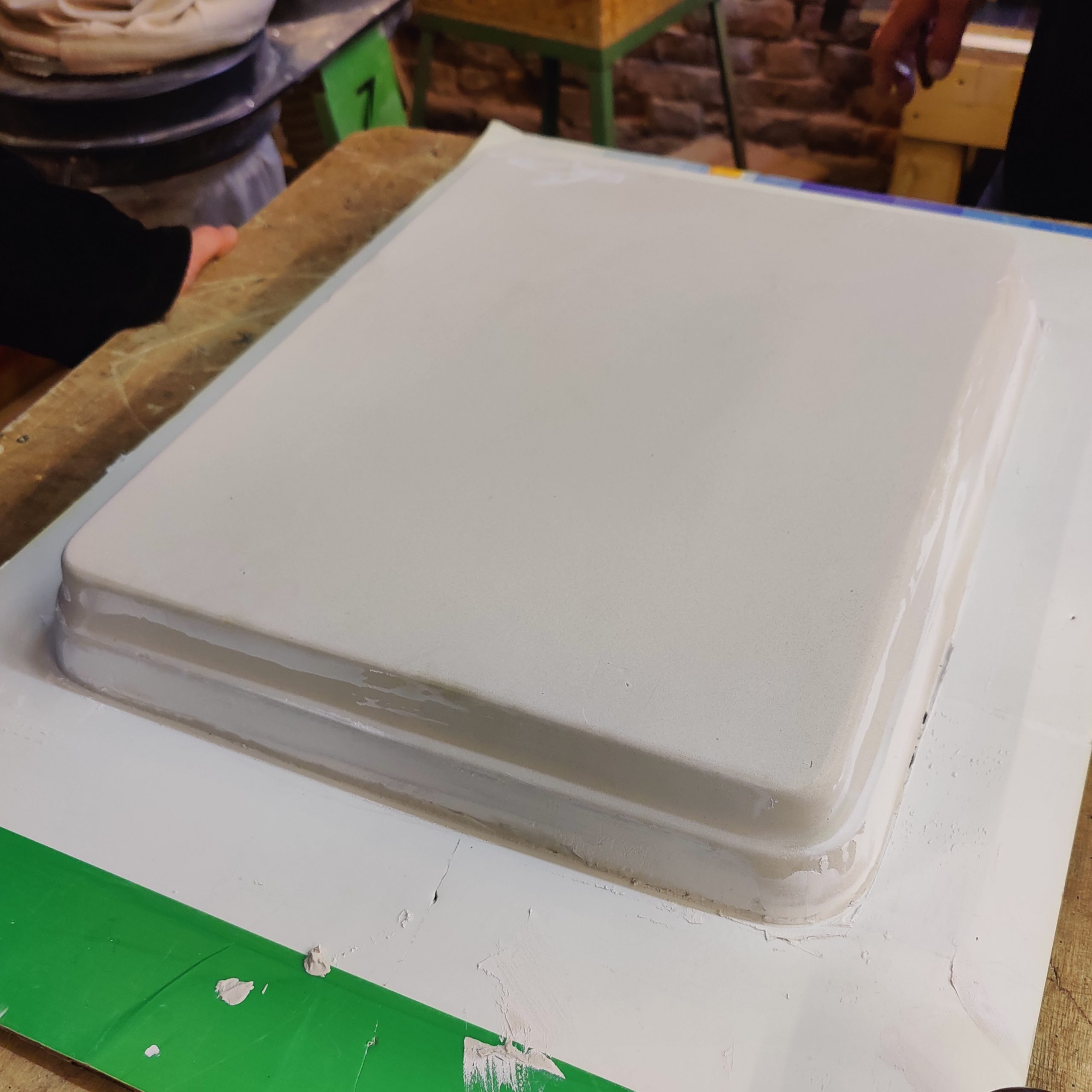 I explained that he first needed to reassemble the damaged fragments to create a complete template. Using glue and tape, he was able to temporarily fix the remaining parts of the skylight. Then he was to fill the inside with plaster to produce a stable negative mold. A few weeks later, he brought the finished plaster mold back. Together we sanded the areas where the old fracture lines were still visible and smoothed the surface a bit.