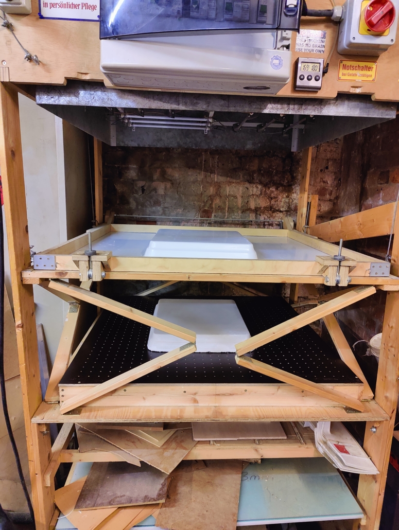 On the self-built vacuum forming table aboard the c-base, we vacuum-formed several sheets over the mold. To do so, we heated plastic sheets until they became pliable enough to form over the mold under vacuum. The first attempts failed — the temperature wasn’t quite right, and wrinkles formed, known in the trade as “webbing.” After two more tries, we finally achieved a clean pull without distortions.