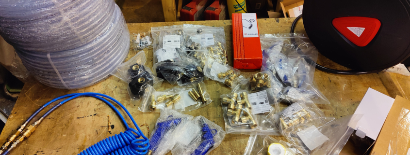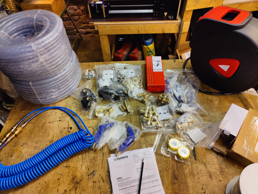 In this expansion stage I used simple hose clamps. This solution was quickly available but turned out not to be optimal, since it is not easy to achieve a tight seal without overtightening the threads. I was repeatedly advised to use double-ear hose clamps, which are said to be better suited for permanent installations. For the further expansion of the compressed air network on the upper floor I will try these out.