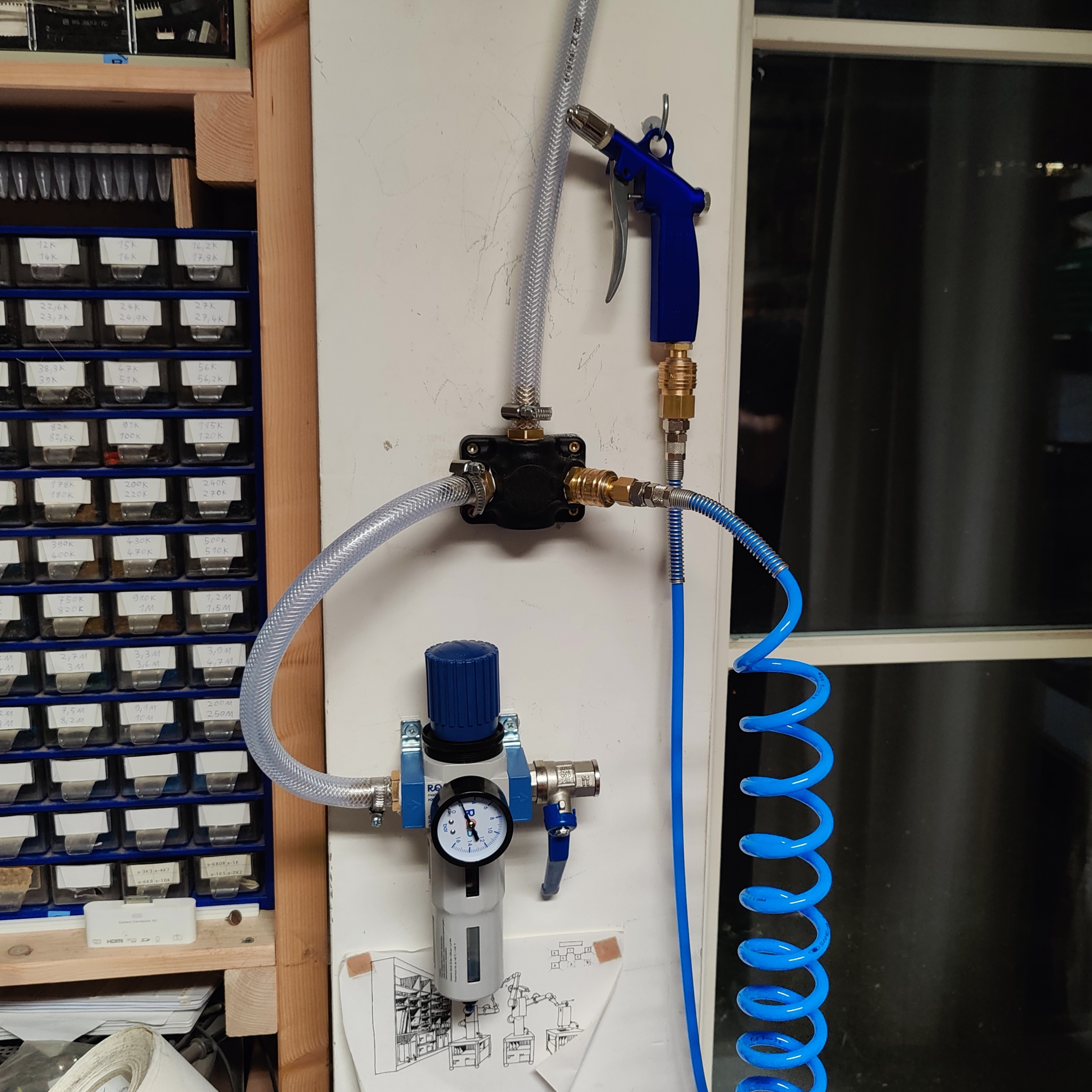 In the first step, with the help of many members, I installed the compressed air lines on the lower floor. The c-lab received its own connection for the laser cutter, supplemented by a pressure regulator and an additional air filter with a wall outlet. This allows devices to be blown out without fine particles or oil residues causing problems. In the workshop I laid permanent connections to three machines. The CNC mill, drill press and scroll saw are operated through a pressure regulator that reduces the working pressure to values between 1 and 2.5 bar, depending on requirements. I also installed several wall connections where mobile tools can be operated at full pressure.