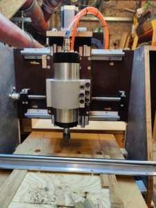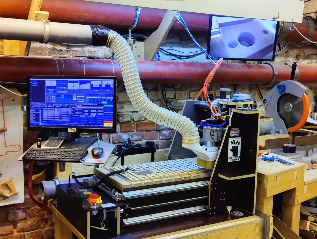 Camera and monitor (April 2024) A USB endoscope camera mounted near the spindle, pointed at the cutter, with a monitor next to the machine showing the live feed. It gives a close-up view of the cutter during operation, which is useful for judging cut quality and tool condition.