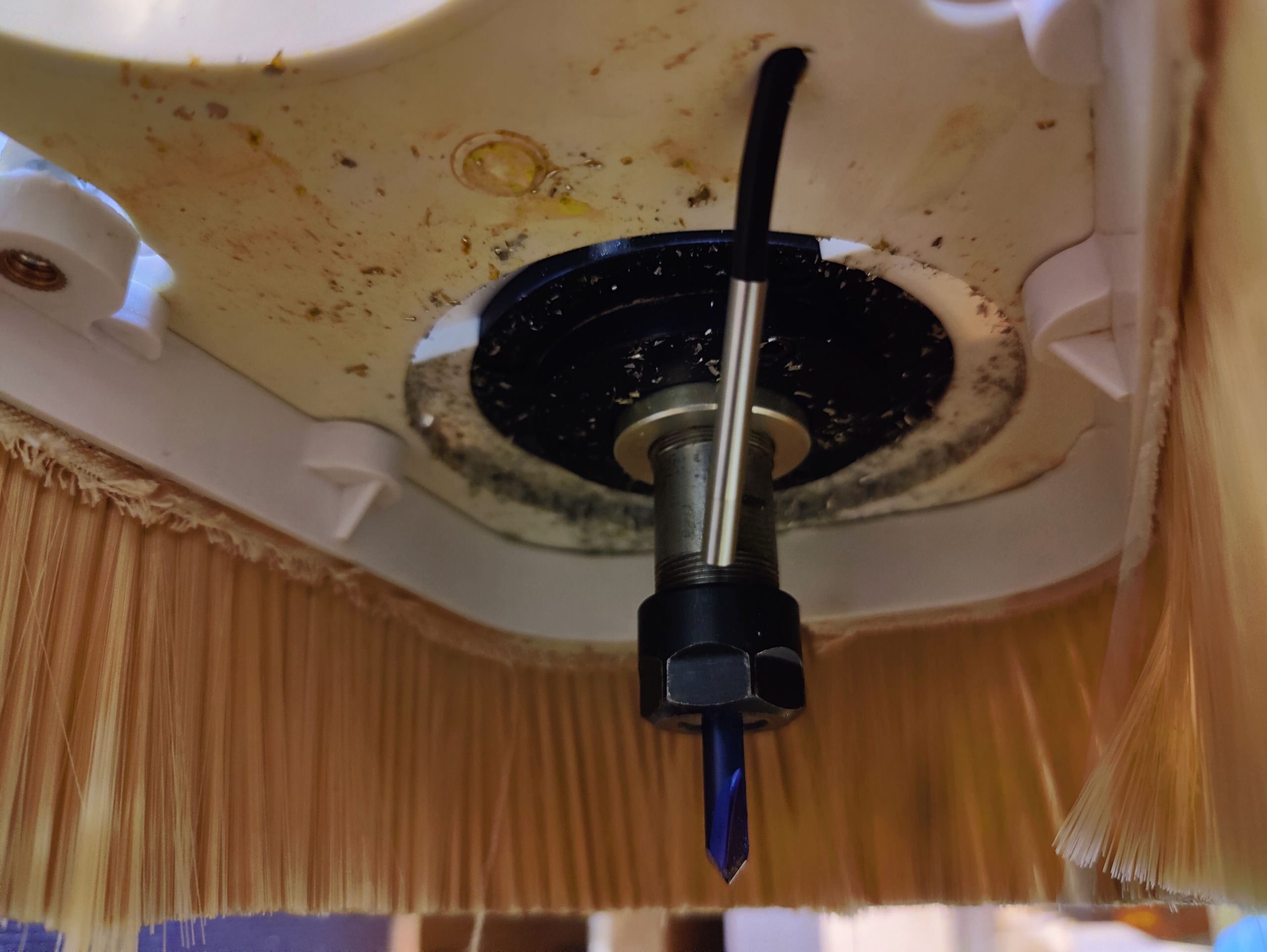 Dust shoe (2023) An off-the-shelf part from China, sized to fit the spindle diameter, with a brush skirt and a port for a flexible hose. Bolted to the spindle with an Allen screw. The shoe clips on and off with plastic clips, which makes tool changes easier – unclip, swap the cutter, clip back on.
