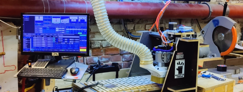 Four of these six upgrades are barely visible in use – they just make the machine more pleasant to operate. The spoilboard and the new control cabinet are the more substantial changes: better workholding, cleaner electronics. c-nancy runs.