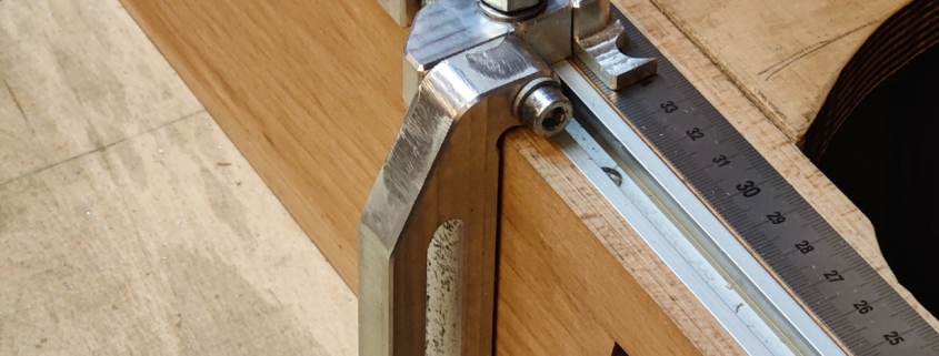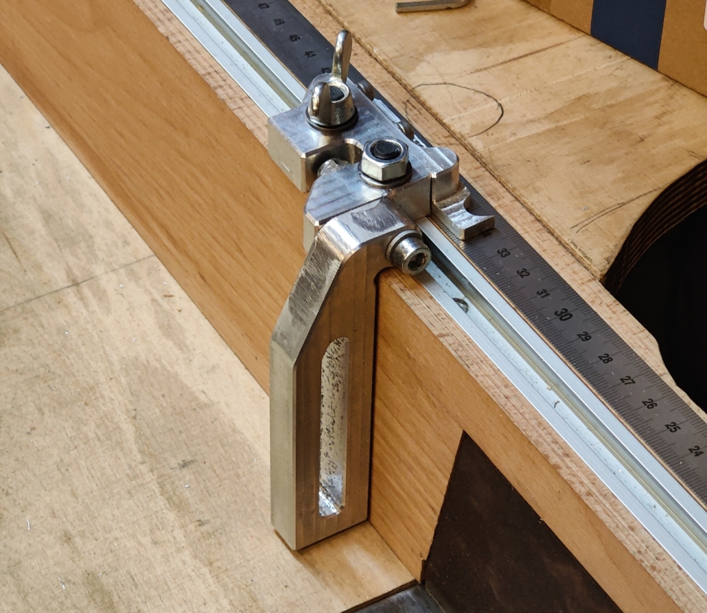 Die fertigen Anschläge bestehen komplett aus Aluminium und laufen relativ spielarm in der Führungsschiene. Sie lassen sich auf wenige Zehntelmillimeter genau einstellen. Im Unterschied zu den ersten Versionen aus Kunststoff haben diese nun zusätzlich einen kleinen Zeiger, der auf das Lineal hinter der Schiene zeigt. Dieser Zeiger ist um sechs Millimeter justierbar, unabhängig vom Anschlag selbst. Damit lässt sich zum Beispiel die Schnittbreite des Sägeblatts ausgleichen oder kleine Ungenauigkeiten korrigieren. Der Zeiger ist mit zwei kleinen Schrauben fixiert und kann gelöst, verschoben und wieder arretiert werden. Dadurch lassen sich die Anschläge relativ einfach kalibrieren.