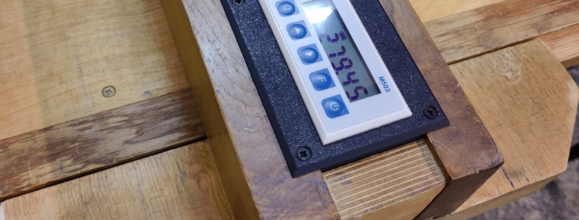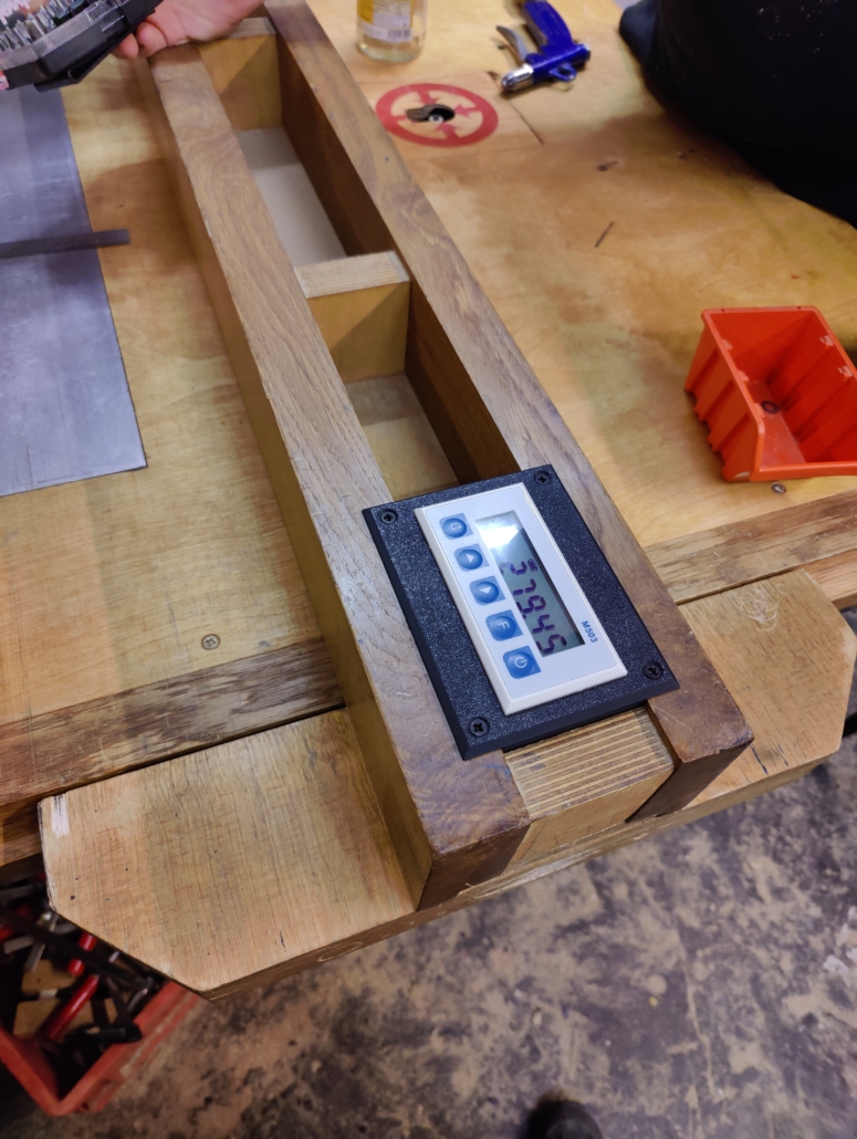 The table saw with tilting router lift at c-base has been in its current form since 2017, including the parallel fence made from oak. What the machine lacked until now was any way to read off the distance from the saw blade to the fence directly. That changed when I came across cheap digital readouts on AliExpress. At 27€ for the complete DRO unit, the barrier to just giving it a try was low enough. The package sat in a drawer for a few months before we got around to it one evening.