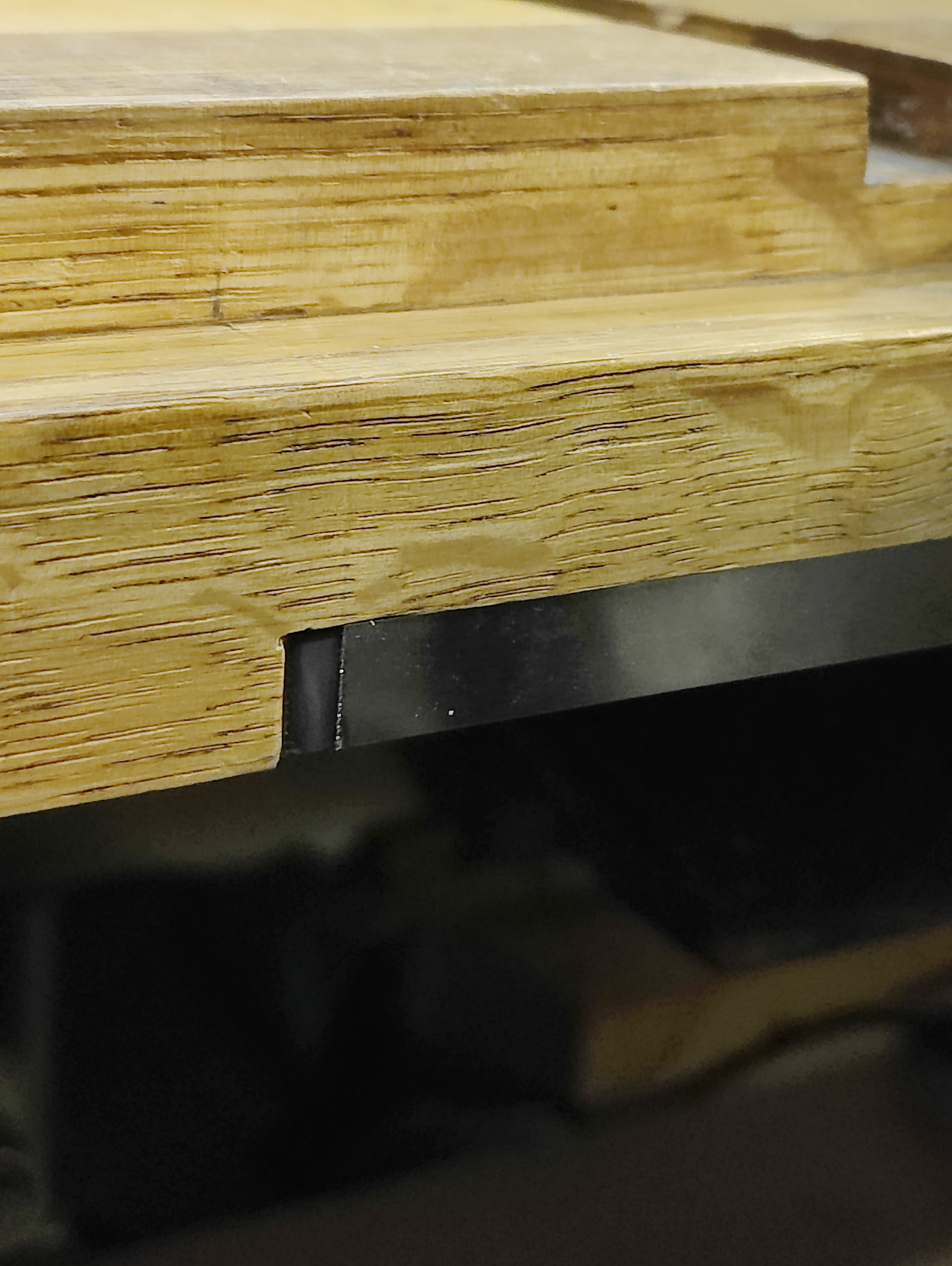 The DRO measures a single value: the distance from the saw blade to the parallel fence. We milled a shallow groove into the oak rail and pressed the magnetic tape in, fixed with its factory-applied adhesive. Adhesion was fine from the start. The sensor sits on the underside of the sliding shoe that runs along the oak rail.