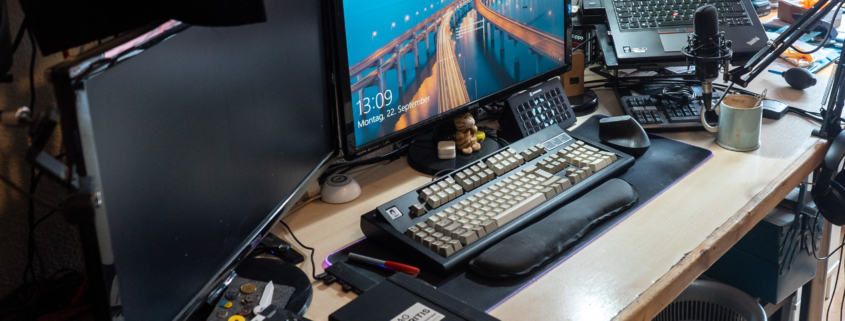 For video calls and talks I run OBS on the desktop. OBS is free software originally built for live streaming, but it works excellently as a virtual video mixer – I can combine camera feeds, screen content and other sources and feed the result into video calls as a virtual camera. The main camera is a Logitech Brio 4K. An old 720p USB webcam serves as a room camera – more of a curiosity than a serious component. An Elgato Stream Deck XL, a control surface with 32 programmable keys each with a small display, handles OBS and other functions. A DaVinci Speed Editor sits on the desk for video editing, a dedicated hardware controller for DaVinci Resolve.