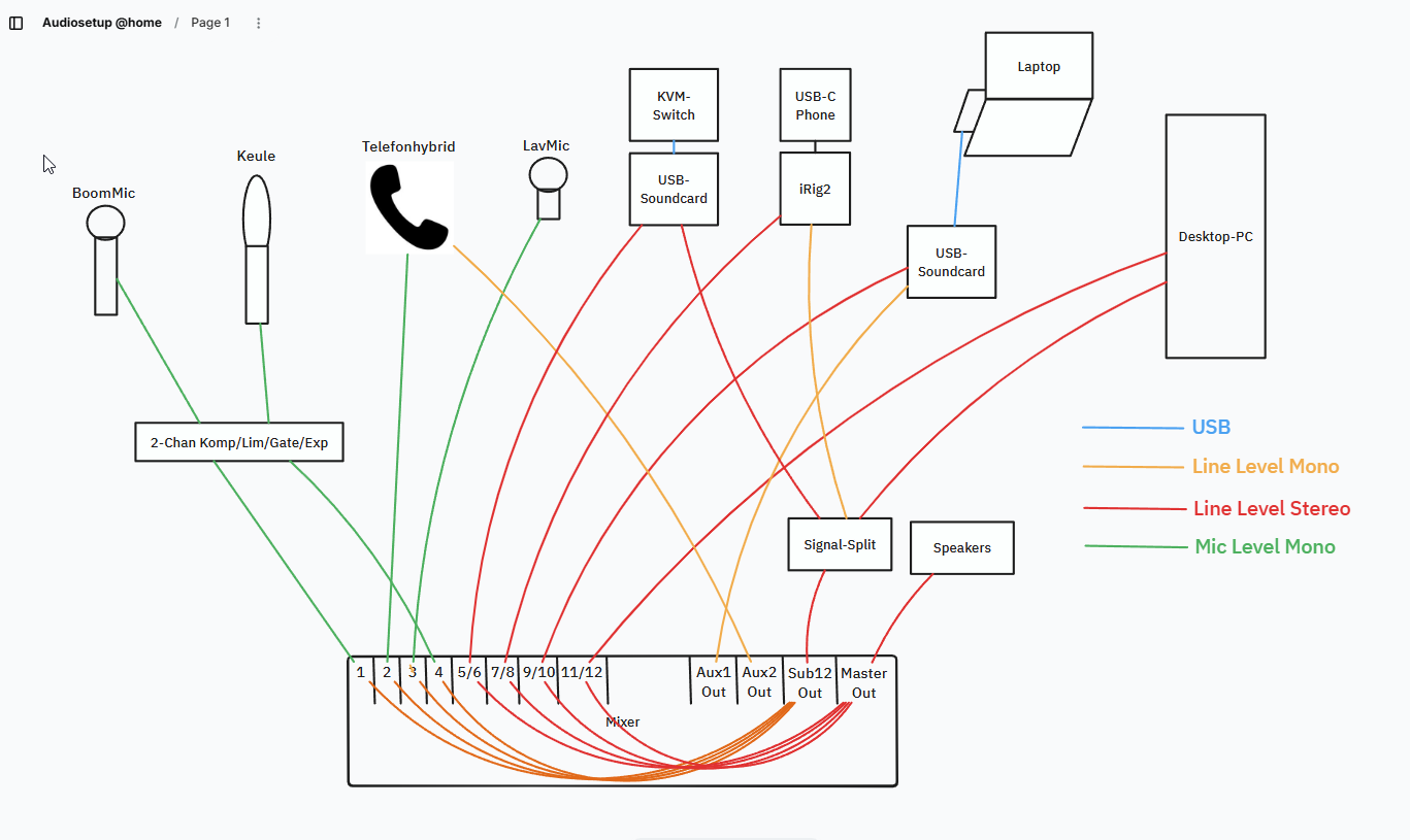 Alle Mikrofone und Eingänge laufen intern auf einen gemeinsamen Summenbus, Subgroup 1-2 in der Mischpult-Sprache. Von dort geht das Signal in einen Behringer HA400, eigentlich ein Kopfhörerverstärker mit vier Ausgängen, den ich als Signalverteiler zweckentfremde. Er splittet das Summensignal auf drei Wege gleichzeitig: einen KVM-Switch mit eigener USB-Soundkarte (damit bekommt mein Arbeits-Notebook per USB-C das Audio des Mixers), einen USB-C-Ausgang für mein Smartphone als vollwertiges Duplex-Audiointerface, und meinen Desktop-Rechner. Der Master-Out des Mixers läuft auf JBL 3-Series MkII Studiomonitore, meine Lautsprecher.