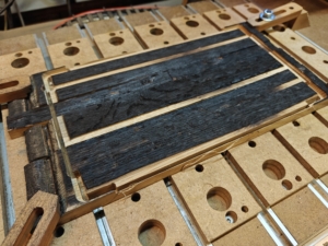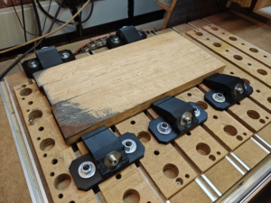 Barrel staves are curved – they were part of a round barrel. Before CNC machining, the staves had to be cut to length, assembled from multiple pieces and then face-milled flat. For the face-milling I designed and printed a clamping system in PETG: toe clamps that hold the workpiece from the side, leaving the surface completely clear. They worked on the first try. The staves also needed to be brought to consistent thickness.