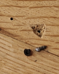 A screw snapped while tightening the latch. I chiselled out the affected section, removed it, fitted a piece of matching wood, sanded it flush and refastened the latch. The latch covers the spot completely.