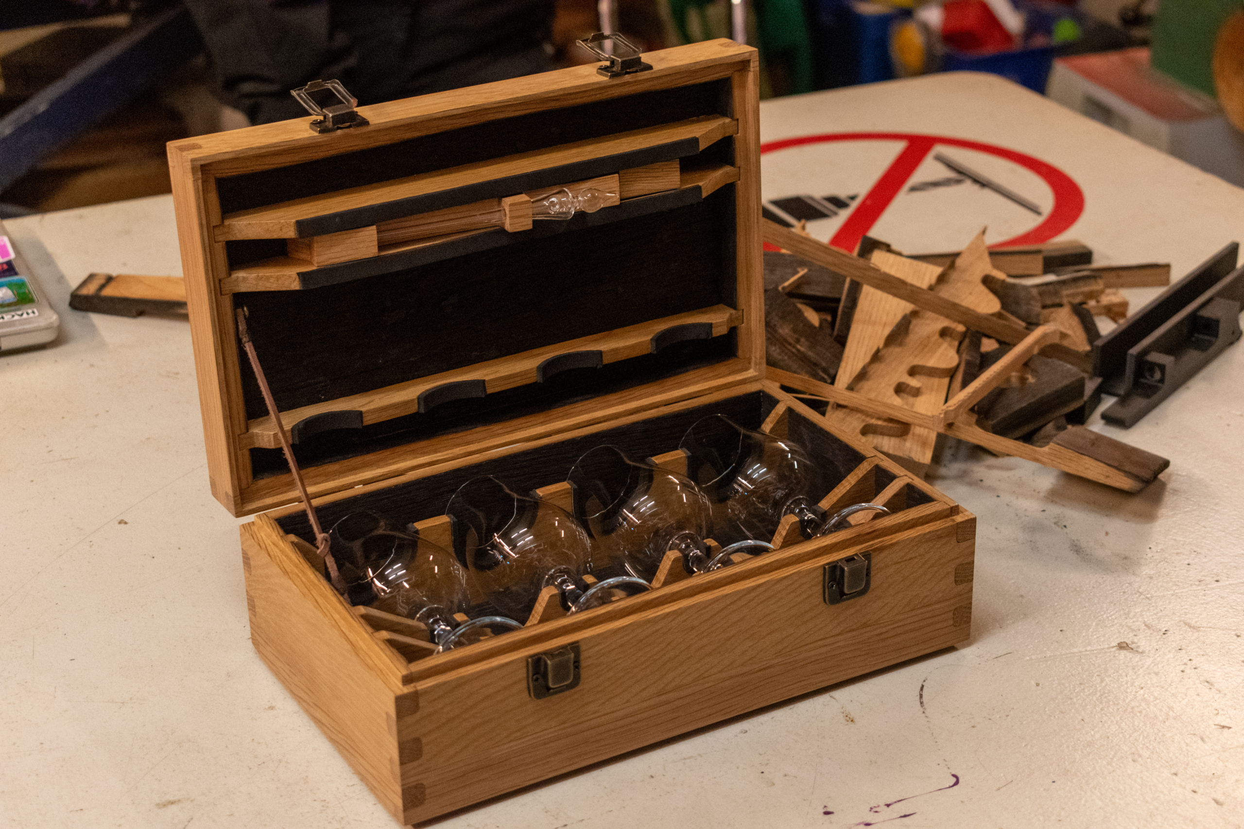 The box has been finished since April 2026. The glasses sit securely, the lid closes cleanly. I’ll be using the toe clamps again for future projects involving curved or otherwise difficult-to-clamp material.