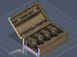 In November 2025, a friend scanned one of the glasses for me. Based on the scan I drew up the construction in Fusion 360. The dimensions – 30 x 18 x 10 cm – came directly from the 3D model of the glasses and the clearance needed inside. Hinged lid with a latch.